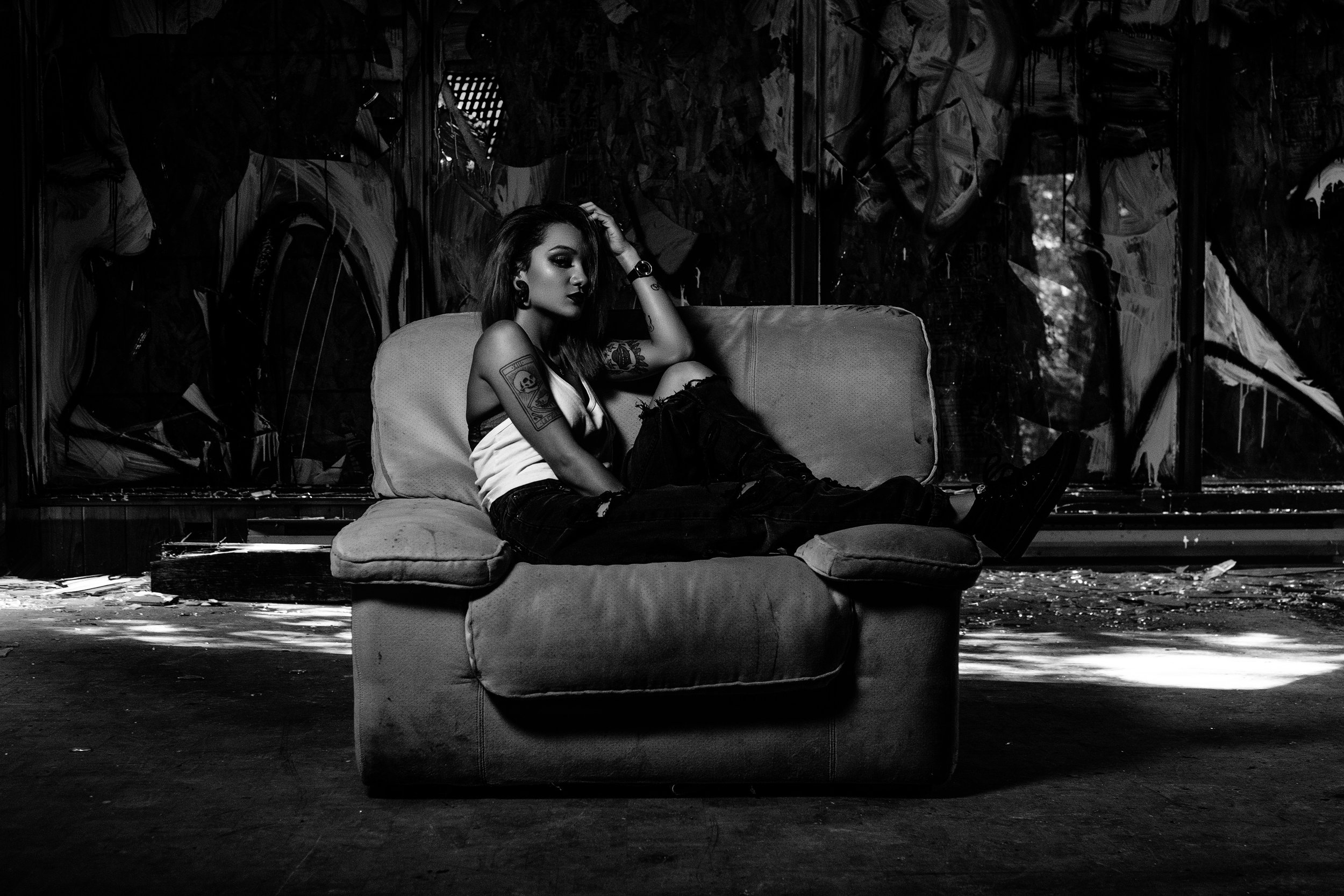 Black and white photo of a woman with tattoos, wearing a tank top and jeans, sitting in a thoughtful pose.