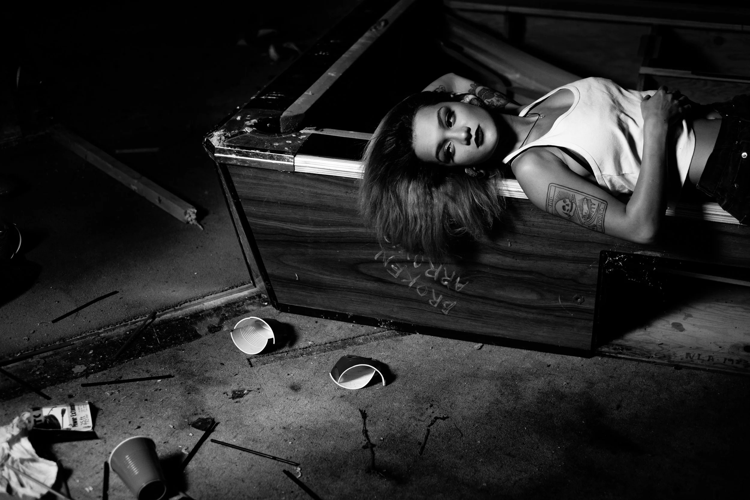 Black and white photo of a woman lying on a broken pool table, surrounded by scattered debris and cups. She is wearing a tank top and has tattoos on her arm.
