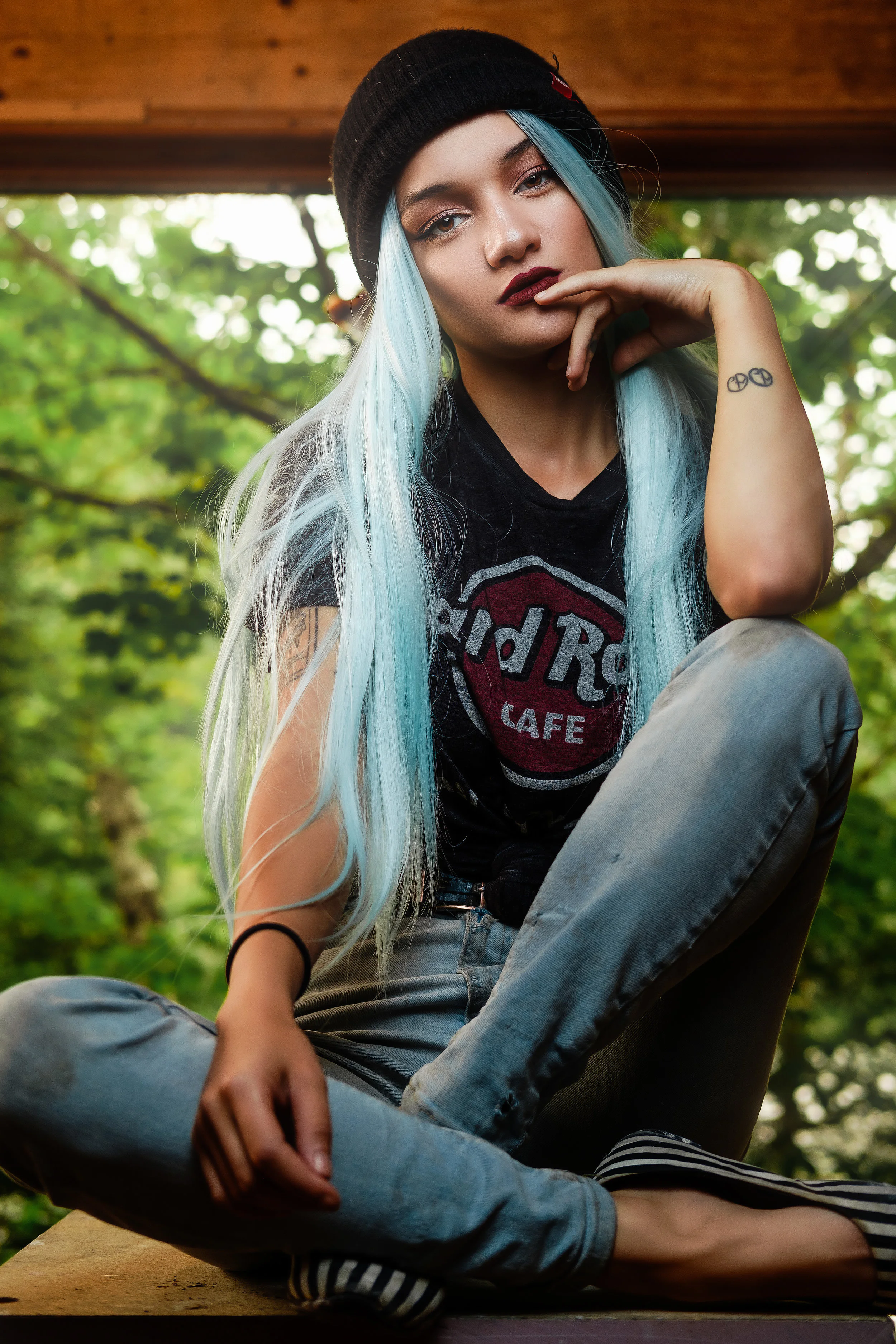 Person with long blue hair wearing a beanie and a Hard Rock Cafe t-shirt, seated against a blurred green leafy background. View fullsize