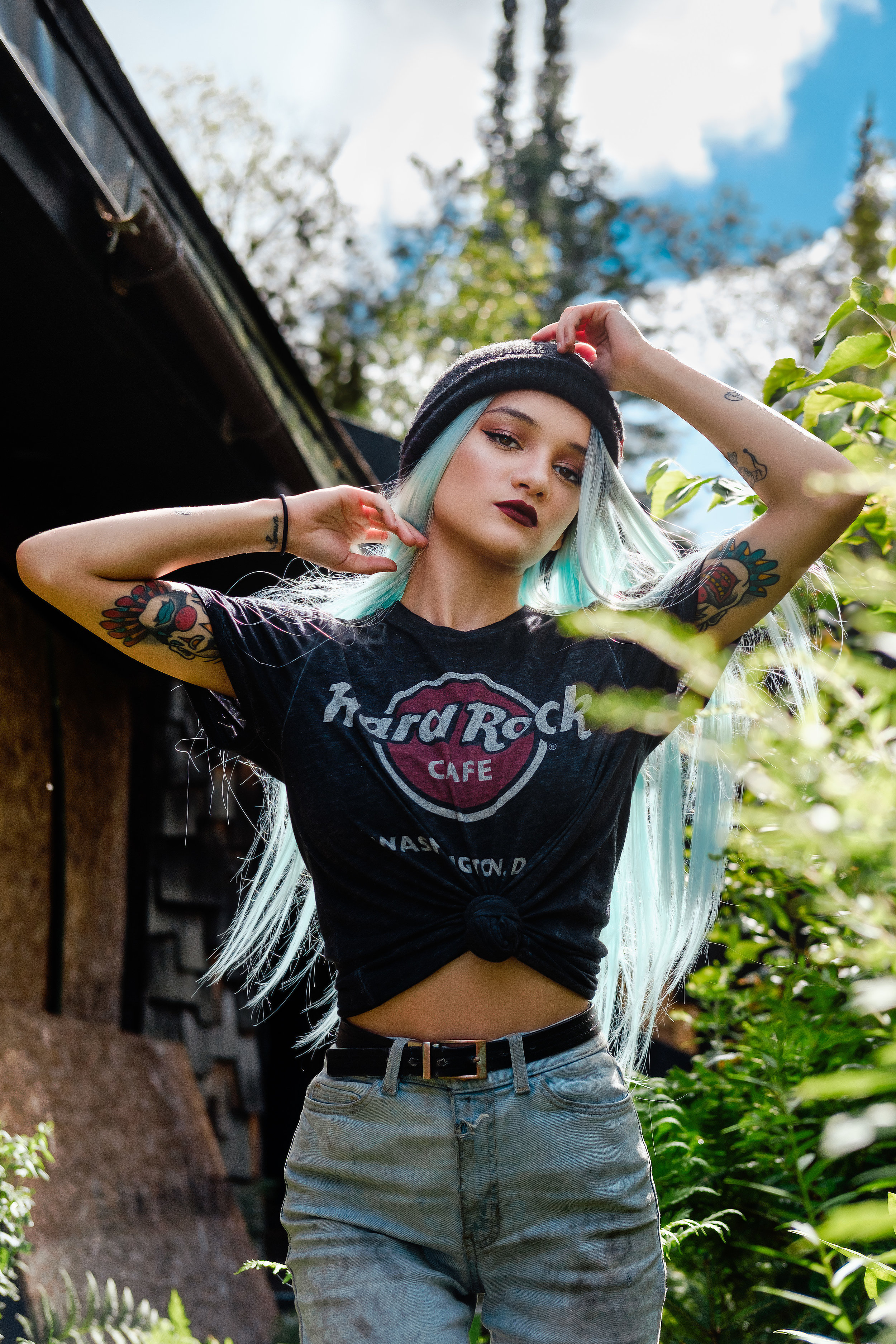 Person with long blue hair wearing a beanie and a Hard Rock Cafe t-shirt, seated against a blurred green leafy background.