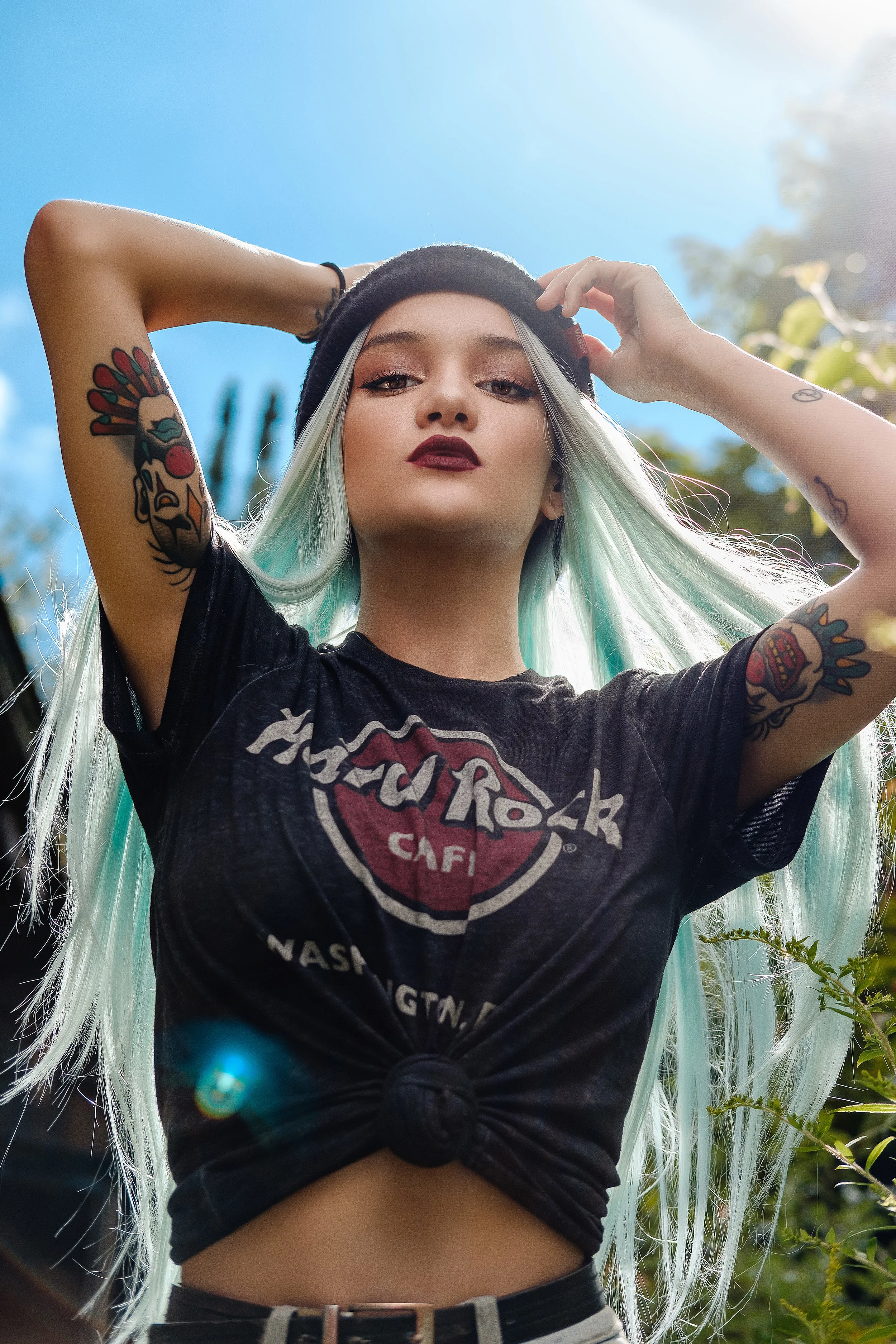 Person with long turquoise hair wearing a black Hard Rock Cafe t-shirt and black hat, with tattooed arms, standing outdoors under a blue sky. View fullsize