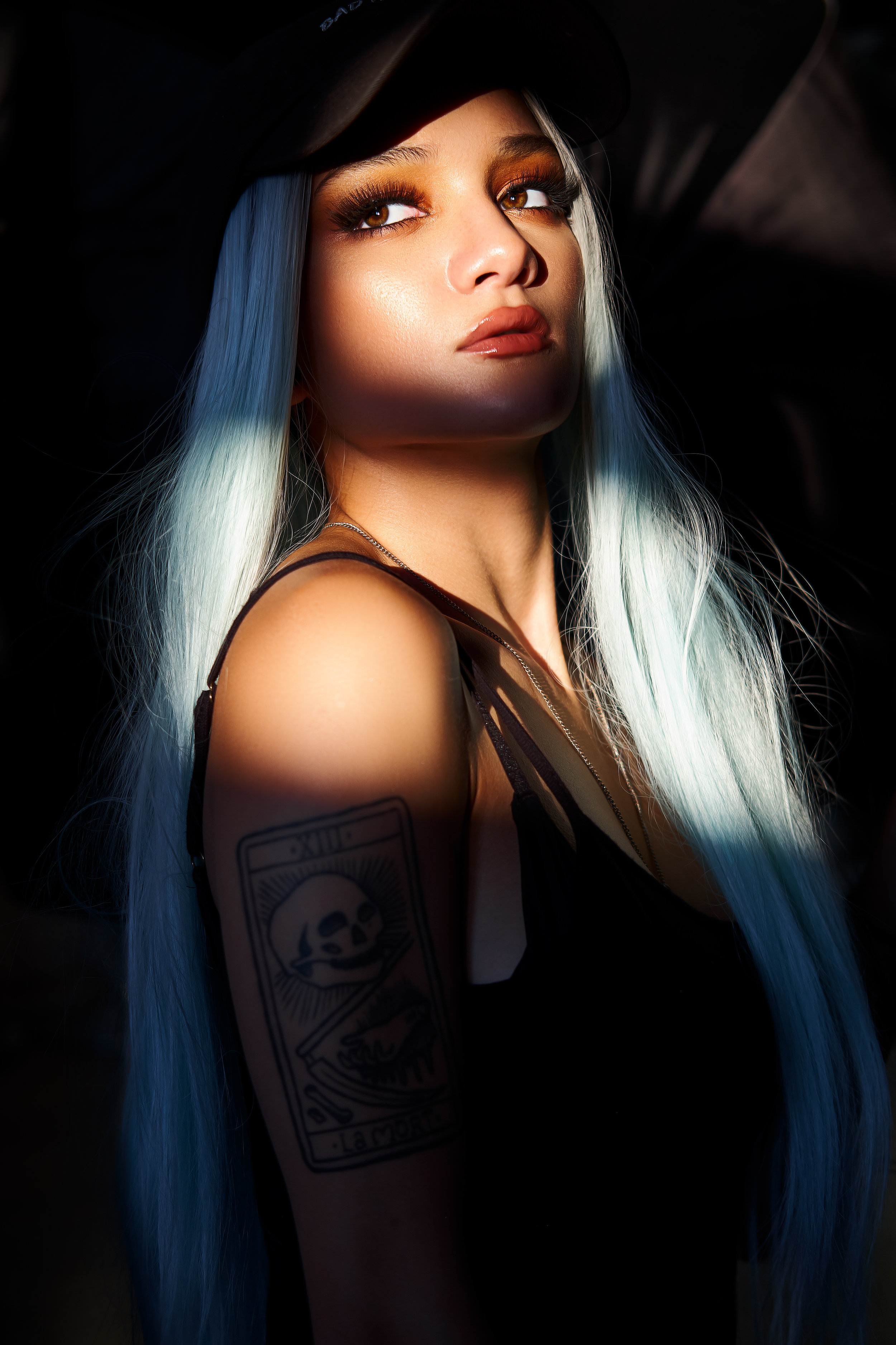 Person wearing a black hat and black dress with tattoos and long blue hair in bright lighting.