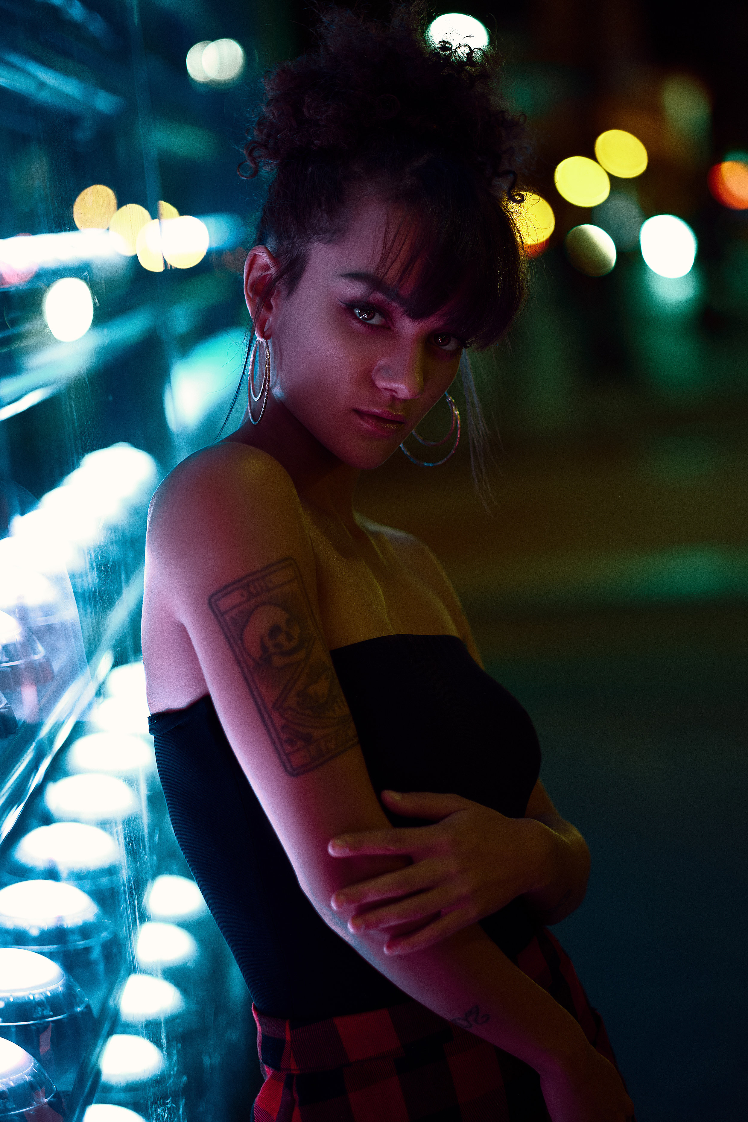 Young woman with hoop earrings and tattoo near neon lights at night, wearing a black strapless top and red plaid skirt.