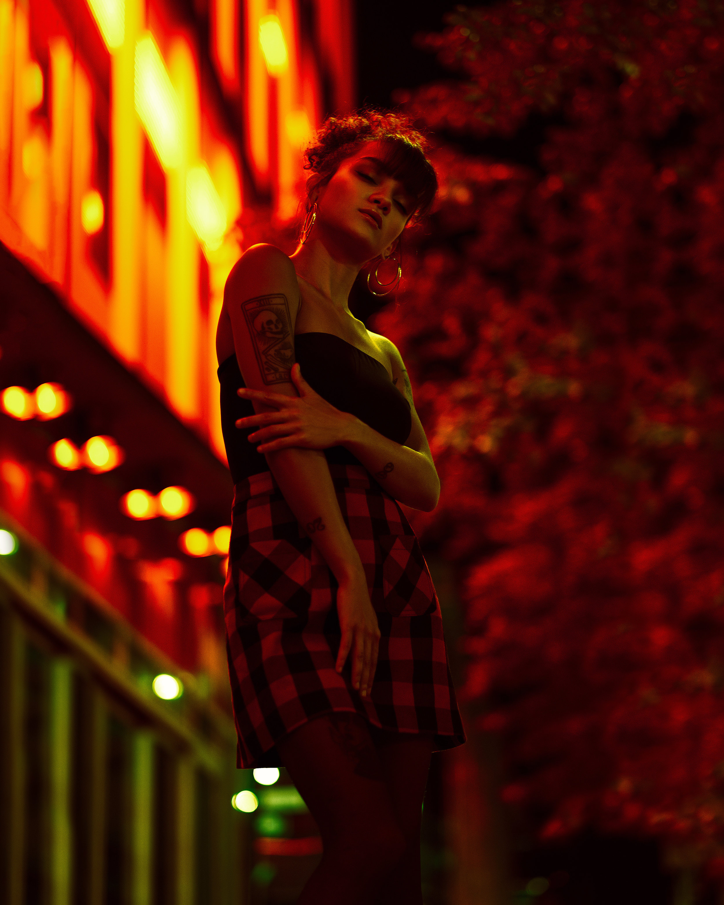 A person stands under red neon lights wearing a plaid skirt and tank top, with tattoos on the arms. The background features a building and trees, creating a dramatic nighttime scene. View fullsize