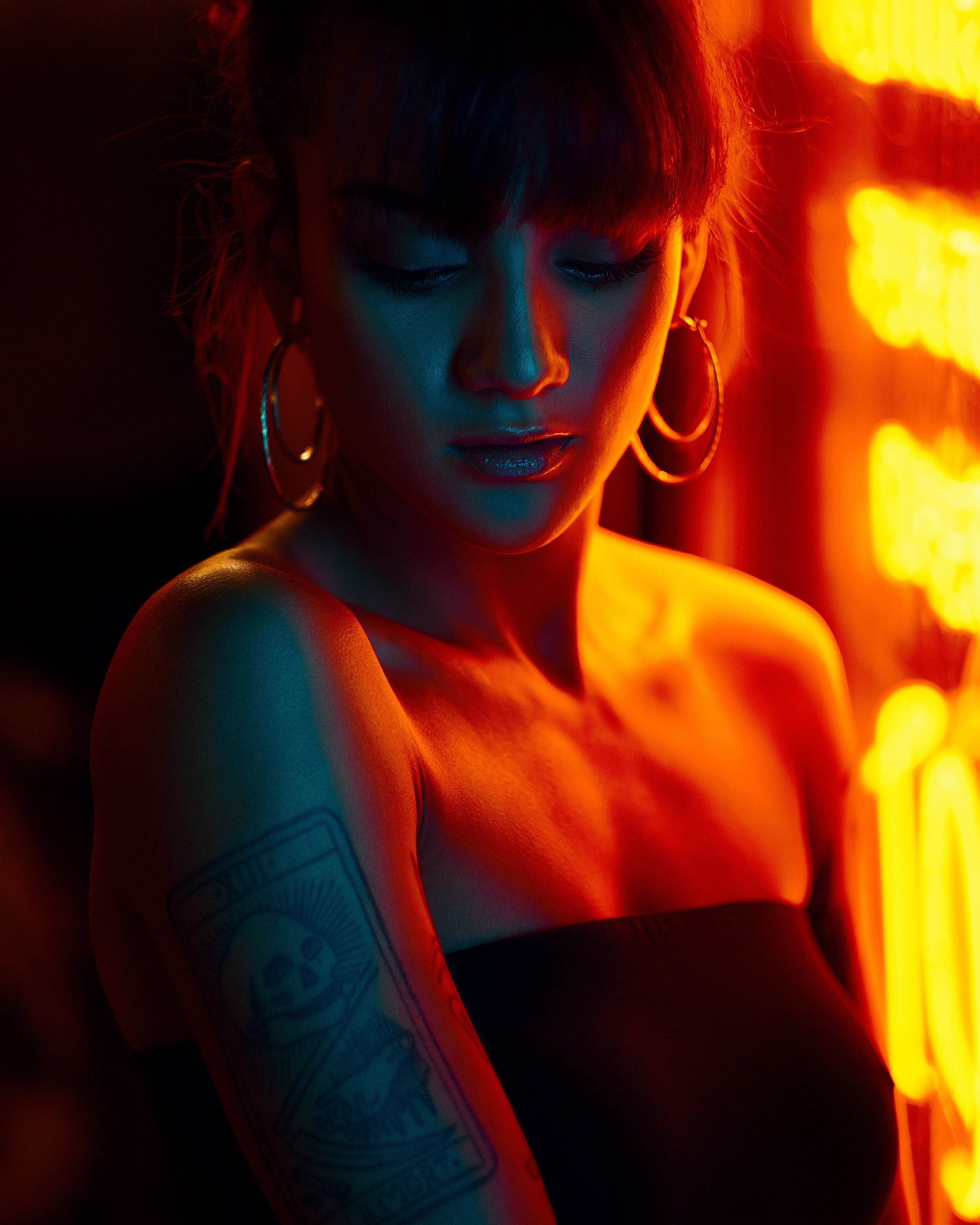 Woman with closed eyes, dark hair, and tattoos on her shoulder, illuminated by neon lights. View fullsize