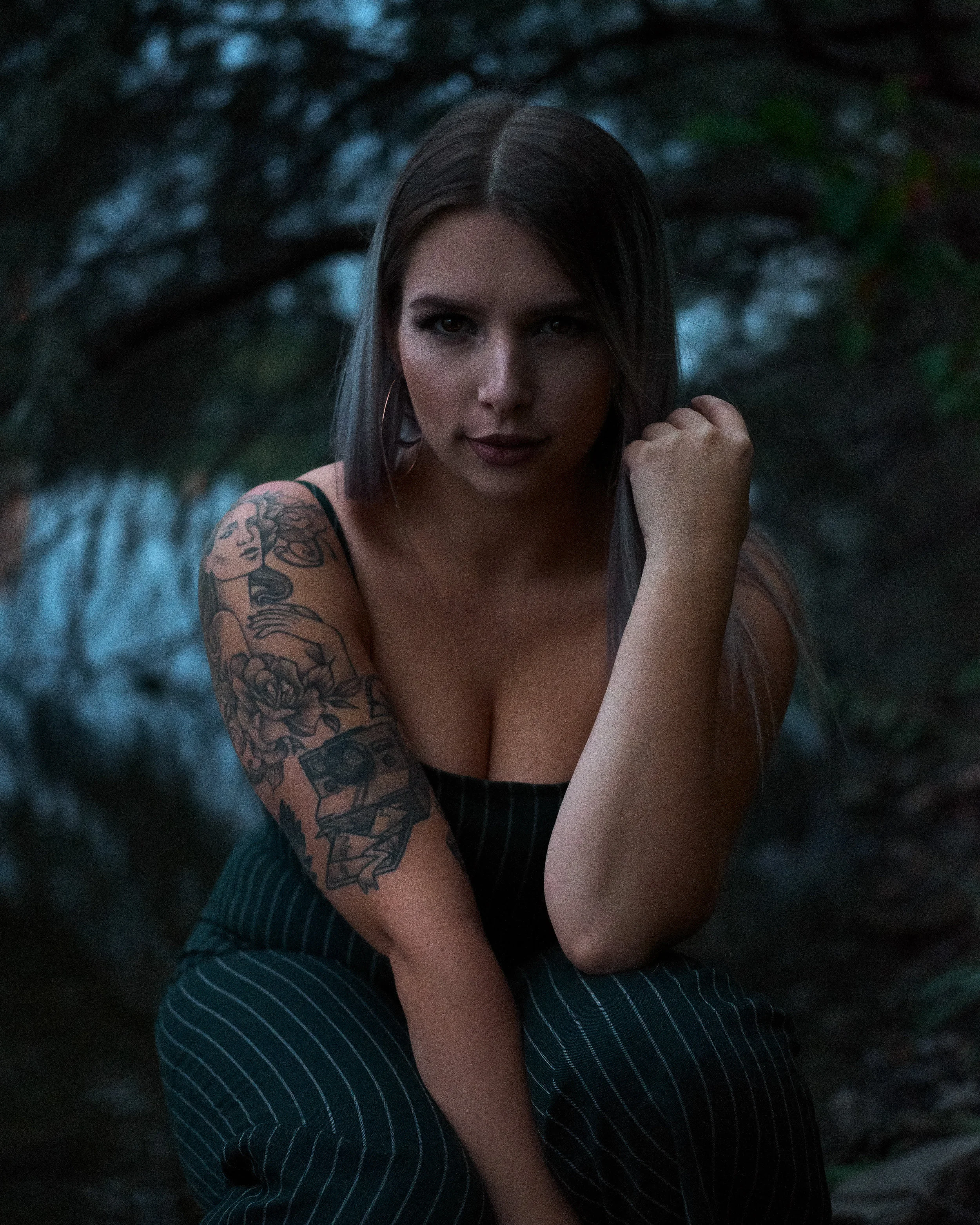 Woman with tattoos sitting outdoors in dark, moody lighting View fullsize