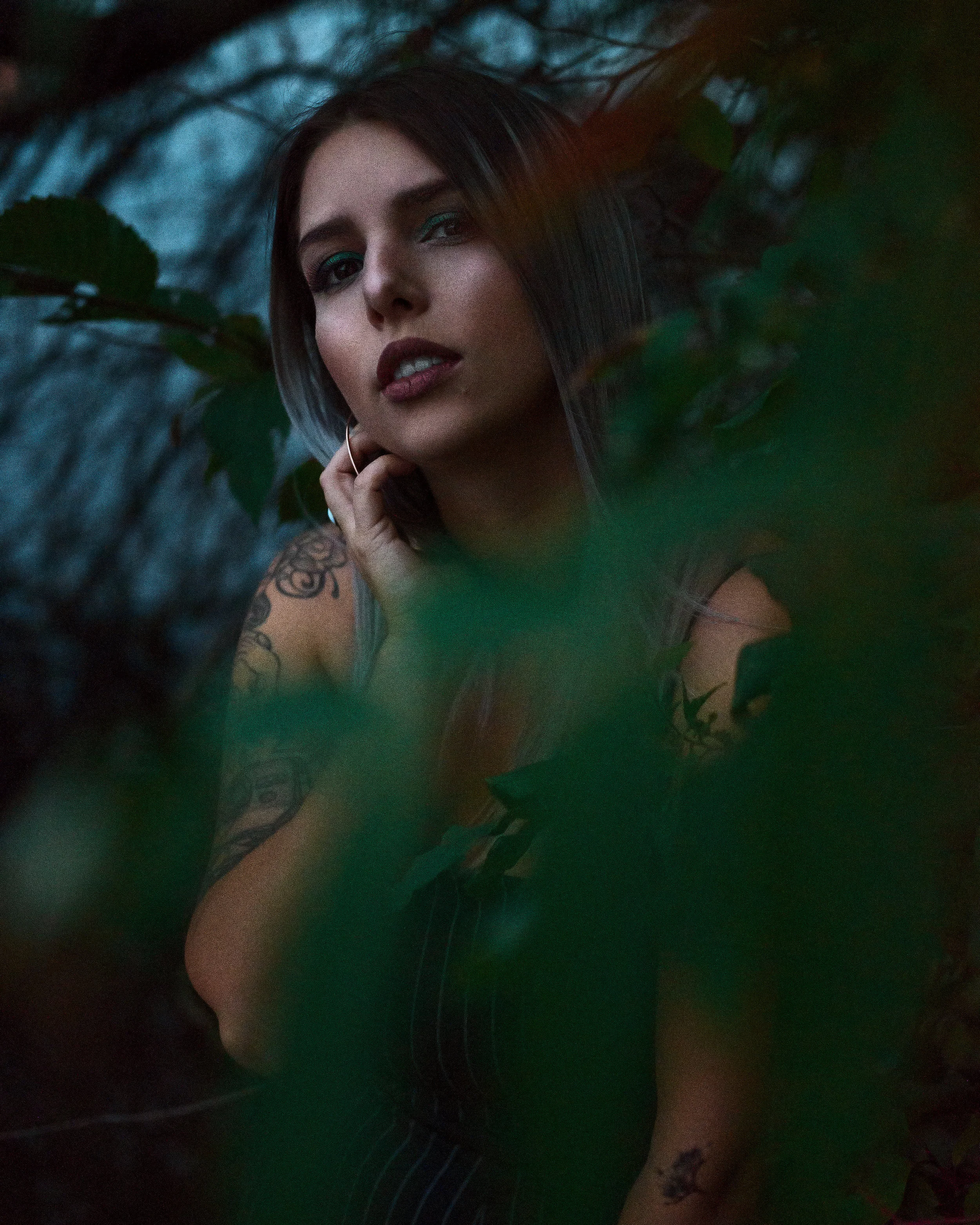 Woman with tattoos sitting outdoors in dark, moody lighting