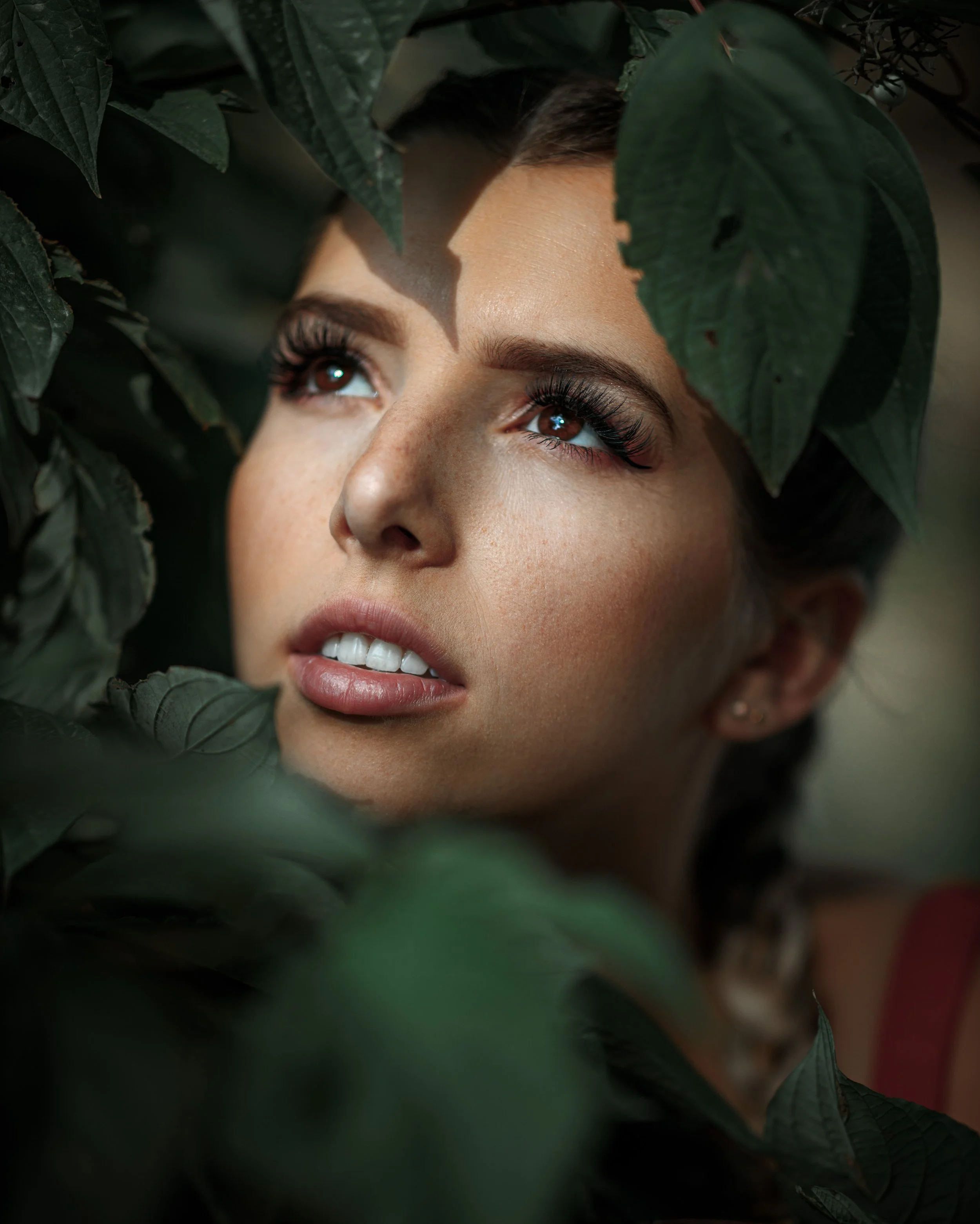 A person with long hair and tattoos surrounded by green leaves in a nature setting. View fullsize